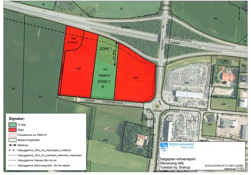 Vejen Kommune er med sin centrale beliggenhed i Sydjylland og med sin gode infrastruktur ideel til placering af erhvervsbyggeri. Nedennævnte erhvervsgrunde udbydes til salg med følgende mindstepriser pr. m2.
