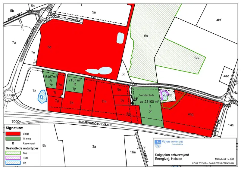 Vejen Kommune er med sin centrale beliggenhed i Sydjylland og med sin gode infrastruktur ideel til placering af erhvervsbyggeri. Nedennævnte erhvervsgrunde udbydes til salg med følgende mindstepriser pr. m2.